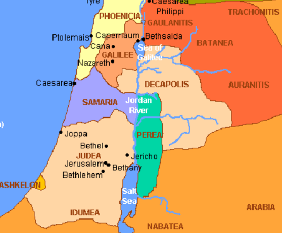 Jesus is portrayed in the Christian sources as conducting most of his public life in Galilee, which was under the control of King Herod’s son, Herod Antipas. In the closeup of the area in the map below, Galilee is shown in a dark peach color in the upper left quarter of the map. The sources agree that at the end of his life Jesus was in Judea to participate in the Jewish celebration of the Passover at the Temple in Jerusalem, where animal sacrifices were made to the God of the Jews. At the time Judea was under the direct control of the Romans via the governor Pontius Pilate, although he left much of its administration to the Sanhedrin, a body primarily composed of elders of the Jewish priestly families overseeing the Temple. Judea is colored tan in the lower left quarter of the map.